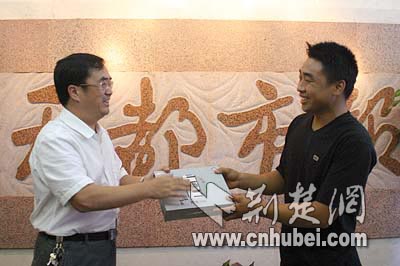 湖北日報報業(yè)集團(tuán)總編輯江作蘇為荊州的幸運(yùn)讀者送上時尚多媒體手機(jī),他是讀報有獎活動的第四位幸運(yùn)讀者,一大早就和女朋友從荊州趕往武漢,他告訴記者,從活動開始他就一直在發(fā)短信答題,每天都要發(fā)好幾條。