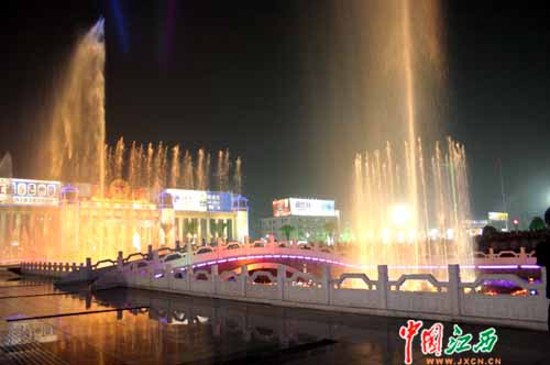 百米長(zhǎng)的音樂噴泉伴隨著《中國(guó)人民解放軍進(jìn)行曲》、《走進(jìn)新時(shí)代》等雄壯的樂曲翩翩起舞