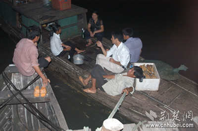 浮橋下面,江面的幾戶漁家把船靠上浮橋,聚在一起拉家常,享受著一天勞動(dòng)的喜悅,也將自己一天捕獲的魚蝦擺上橋面,等待買家,聽著他們歡快的笑聲,知道他們?cè)撌怯辛艘粋(gè)好的收獲。