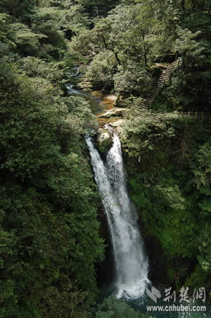 參觀完兩處紅色旅游景點(diǎn)之后,記者們順道觀光了龍?zhí)讹L(fēng)景區(qū)。龍?zhí)段挥诖钠何鞅逼吖,是近年?lái)開(kāi)發(fā)的以自然與人文景觀相結(jié)合的旅游風(fēng)景區(qū)。據(jù)介紹,當(dāng)?shù)氐奈迳窈邮驱執(zhí)丁拔逄妒似佟钡脑慈。溪水沖擊小井峽谷后,陡然跌落絕壁之下,又連續(xù)飛下四級(jí)斷崖,形成梯狀的五個(gè)氣勢(shì)磅礴的瀑布和深潭,這就是碧玉、金鎖、珍珠、飛鳳、玉女等五潭五瀑。細(xì)察五潭,碧水泱泱,樹(shù)影幢幢,崖壁如刀削斧鑿,崖腳怪石,汀芷競(jìng)秀,綠蔭覆蓋四周。仰觀五瀑,潭潭無(wú)俗水,瀑瀑似神女。