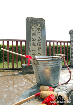 紅軍長征后,國民黨反動派幾次把井填掉,群眾幾次把井挖開。幾填幾挖,激怒了反動派,便下了一道挖井禁令:“誰挖井,誰殺頭!”1950年,沙洲壩人民為了迎接毛主席派來的南方老革命根據(jù)地慰問團,將這口井進行了全面維修,并尊稱為“紅井”,在井旁立了一塊木牌,上書“吃水不忘挖井人,時刻想念毛主席”14個大字。后來又將木牌改為石碑,把“吃水不忘挖井人,時刻想念毛主席”14個大字涂上赤金。