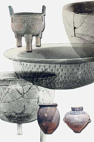 仰韶文化陶鼎;炊器(下左,高27.5厘術)