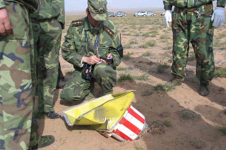 10月12日,搜索人員正在為磁記錄儀定位。當(dāng)日上午,神舟六號(hào)載人飛船火箭殘骸中最重要的磁記錄儀在內(nèi)蒙古鄂托克旗找到。搜索部隊(duì)說,磁記錄儀又稱“黑匣子”,是飛船殘骸中最重要的部件,將被直接送到北京進(jìn)行數(shù)據(jù)分析。