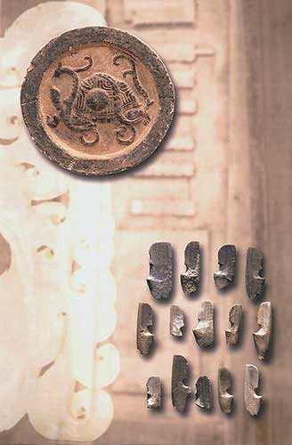 玄武紋瓦當:建筑構件(上,直徑19厘米)