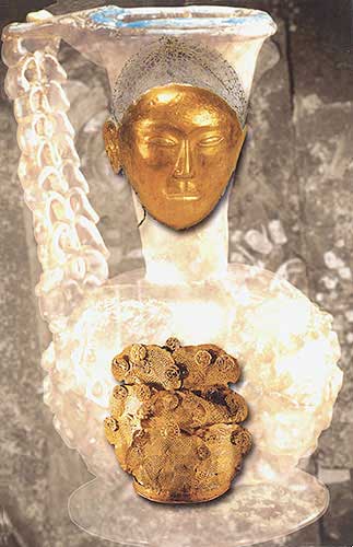 連綴銀絲網(wǎng)絡(luò)金面具:斂葬用具(上,面具長(zhǎng)21.7厘米)