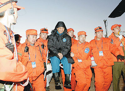 5分鐘后,兩名航天員在工作人員的簇?fù)硐拢M(jìn)入著陸點100米開外的一架直升機內(nèi)全面體檢,工作人員和群眾在外焦急地等待最后的檢查結(jié)果。