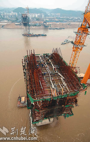這是12號(hào)主塔墩正在進(jìn)行混凝土澆筑的情景。日前,宜昌長(zhǎng)江大橋已完成3個(gè)主塔墩的混凝土澆筑,這標(biāo)志著大橋下部結(jié)構(gòu)工程已基本完成,轉(zhuǎn)入梁體施工階段。宜昌長(zhǎng)江大橋是宜萬(wàn)鐵路重點(diǎn)工程,該橋建設(shè)的順利進(jìn)行,為全路段按期建成通車打下堅(jiān)實(shí)基礎(chǔ)。