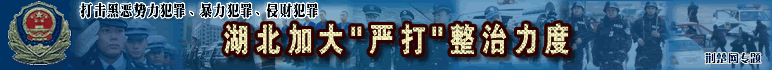 湖北今年嚴(yán)打目標(biāo)確定 省公安廳透露,去冬今春,我省社會治安大局穩(wěn)定,刑事發(fā)案率有所下降,今年將加大嚴(yán)打整治力度,重點(diǎn)打擊黑惡勢力犯罪、暴力犯罪、侵財犯罪……[詳細(xì)]::武漢警方突襲濱江明珠娛樂城 抓獲45名吸毒者 ::全省交警嚴(yán)查盜搶車 一假警車上查處9塊假車牌::湖北圈定106個治安整治重點(diǎn) 武漢市5個地段在列 武漢嚴(yán)打建筑工地惡勢力 [市政法委 各區(qū)舉報電話][把黑惡勢力趕出工地訪談熱線開通]::武漢市政法委副書記:廣泛發(fā)動群眾鏟除沙霸石霸::漢陽鏟除沙石惡霸團(tuán)伙 行兇兩年作惡無數(shù)(圖)