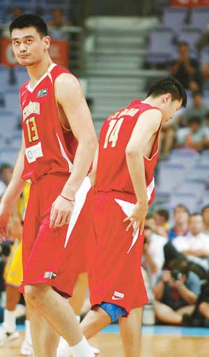 中國隊(duì)球員王治郅(右)上場替換姚明。(新華社發(fā))
