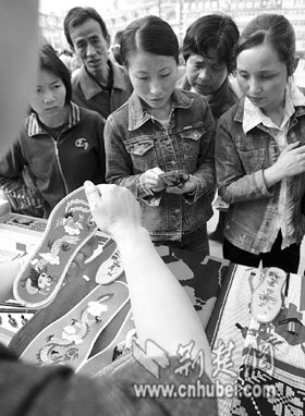 荊楚網(wǎng)(湖北日報(bào))(記者 王威 通訊員 王奇 攝)20日,參加全省農(nóng)民工職業(yè)技能鑒定工作會議的各地代表,在孝感市人民廣場擺開擂臺,展示他們選送的出自于農(nóng)民工之手的各種絕技絕活,并向農(nóng)民工贈送價(jià)值百萬元的技能鑒定圖書。這是我省首次舉辦農(nóng)民工技能鑒定成果展,從精美的竹器到精致的鋼模具,從精細(xì)電子產(chǎn)品到鄉(xiāng)土氣息濃郁的刺繡鞋墊,上百種展品不僅引起了市民的濃厚興趣,也反映出農(nóng)民正由靠勤勞致富向靠知識技能致富轉(zhuǎn)變。記者從會上獲悉,截至8月底,我省已組織農(nóng)民工職業(yè)技能鑒定26.8萬人次,預(yù)計(jì)全年可實(shí)現(xiàn)40萬人次,到“十一五”期末,全省技能勞動者占社會從業(yè)人員的比重將達(dá)到50%。