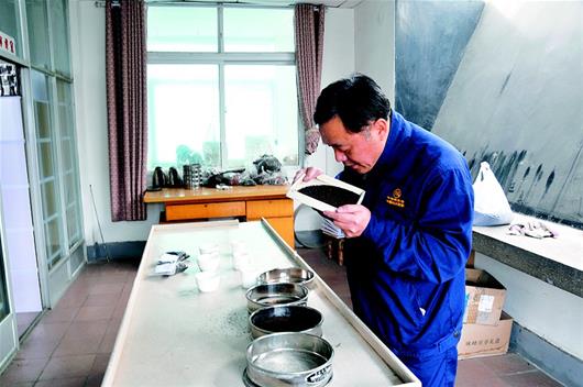 湖北省趙李橋茶廠有限責任公司檢驗室內,59歲的甘多平將青褐色磚茶原料倒入評茶盤內,緩緩搖動后,仔細端詳、細嗅香氣,“顆粒勻、香氣正,這批原料不錯。”