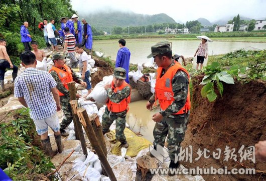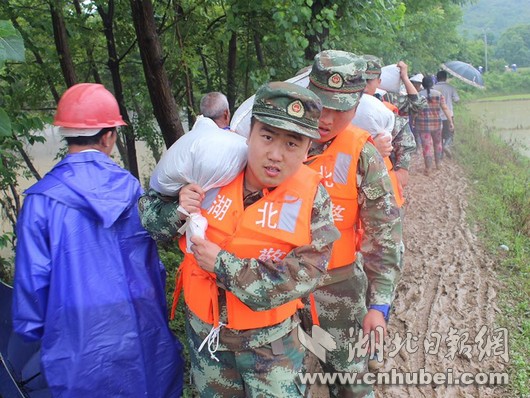 災(zāi)情就是命令,武警湖北總隊咸寧支隊立即啟動應(yīng)急機(jī)制,按預(yù)案迅速出動官兵20余名,攜帶救生繩、救生圈、編織袋、鐵鍬、洋鎬等工具第一時間奔赴現(xiàn)場,擔(dān)負(fù)裝填沙袋和筑堤任務(wù)。