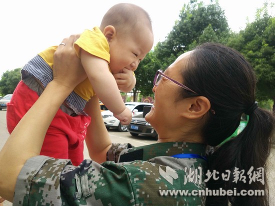 湖北日報(bào)網(wǎng)訊(全媒體記者 張愛虎 通訊員 江開群 秦修)6日上午8時30分,嘉魚縣陸溪鎮(zhèn)鎮(zhèn)長路紅云,到縣防指辦理防汛物資報(bào)領(lǐng)手續(xù),忙完后下樓,正是9時10分,見到婆婆抱著5個多月的兒子蕗熙趕來。乘著采訪的間隙,一身戎裝、皮膚黧黑的路紅云抱著兒子逗玩。