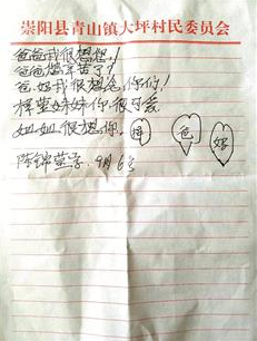 據(jù)陳師傅介紹,他們老家是青山鎮(zhèn)人,現(xiàn)在住在縣城。大孫女錦瑩今年5歲,爸媽帶著十個(gè)月大的妹妹梓瑩在浙江務(wù)工,每隔半年才能抽空回來(lái)看她。6日,聽說(shuō)與爸媽一起做事的舅爺要回浙江,錦瑩就說(shuō)要給爸媽寫封信??墒撬艅偵嫌變簣@,字寫得不好,就央求奶奶握著她的手,一筆一筆寫了這封信,并看著爺爺將信裝在箱子里才放心。哪知舅爺在轉(zhuǎn)車途中不慎將包裹遺失了,錦瑩聽說(shuō)后還哭了鼻子的。