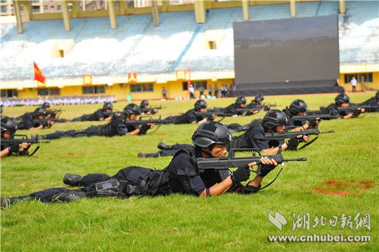 在警務(wù)技能演練之后,武警支隊(duì)、特警支隊(duì)和赤壁市公安局等單位60名民警,進(jìn)行了反暴恐合成作戰(zhàn)演練:公交車上制服歹徒、排爆員移除可疑爆炸物、狙擊手制服恐怖分子、談判專家現(xiàn)場(chǎng)喊話確保人質(zhì)安全……短短10多分鐘,各警種精誠(chéng)合作,成功處置一起暴恐事件。隨后,民警和消防官兵又先后進(jìn)行了重大交通火災(zāi)事故救援處置、突發(fā)事件應(yīng)急處置綜合演練。