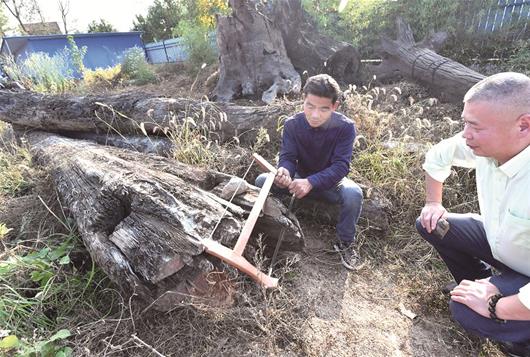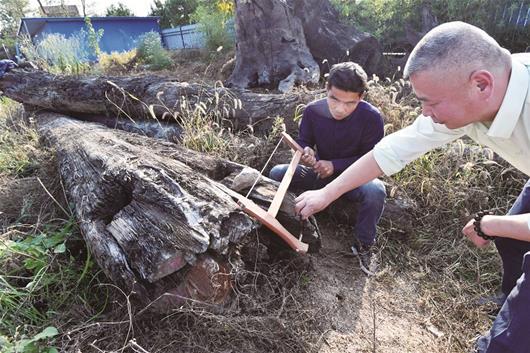 昨日,記者隨幾位園藝、文物專家趕到嘉魚縣城雷軍的家具廠,只見一根木頭分成兩截堆放在草地上,呈黑色,有厚厚樹皮,兩頭還各有一個為方便繩索捆綁打的樹洞。經(jīng)測量,長19米,最寬直徑70厘米。