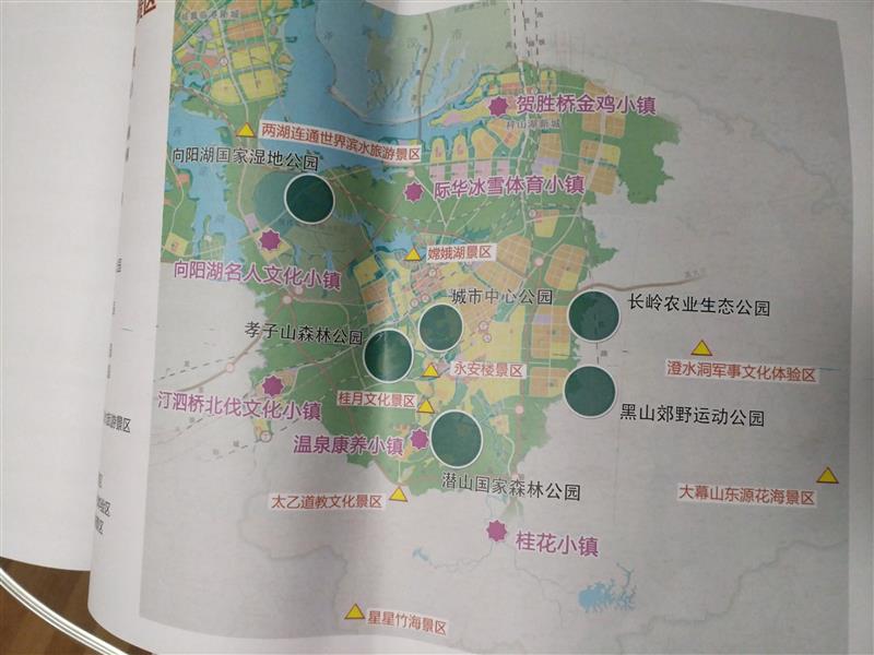 六園:向陽湖國家濕地公園、孝子山森林公園、潛山國家森林公園、城市中心公園、黑山郊野運動公園、長嶺農(nóng)業(yè)生態(tài)公園。