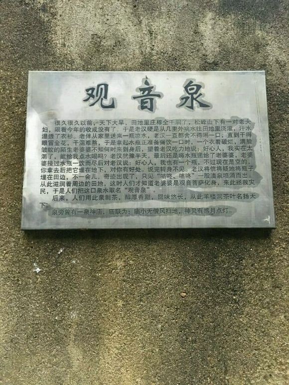 羊樓洞東面松峰山北麓有蒲圻四十八名泉之——觀音泉。觀音泉水穿街而過(guò),泉水之名取自古鎮(zhèn)之南的一口古井,泉水清冽甘甜,永不干涸。傳說(shuō)是大慈大悲的觀世音菩薩,為保這里的山民與茶樹(shù)不受干旱之苦,埋下寶瓶,化為泉井。