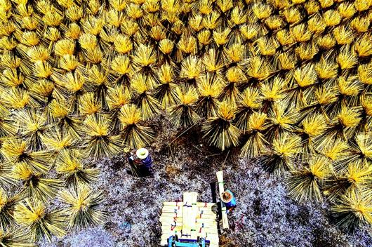 6月25日,咸寧市咸安區(qū)汀泗橋鎮(zhèn)赤崗村鑫源竹加工廠,工人們正在翻曬一捆捆長長的竹筷子,宛如一朵朵花開在曬場上。咸安區(qū)竹資源豐富,當?shù)亟ǔ煽稍偕闹裱h(huán)產(chǎn)業(yè),有上下游竹加工廠20多個,滿山翠竹成為當?shù)剞r(nóng)民的“致富竹”。