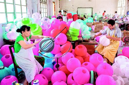 7月17日,崇陽縣銀豐工藝有限公司工人在制作紙燈籠。崇陽縣沙坪鎮(zhèn)素有手工制作燈籠的傳統(tǒng),該企業(yè)現(xiàn)有200多名職工,以周邊鄉(xiāng)村的婦女為主,其手工制作的金粉燈籠遠銷歐洲、北美、東南亞等地區(qū)的20多個國家,今年上半年完成1100多萬元的訂單。(視界網(wǎng) 黎志遠 汪佳 攝)