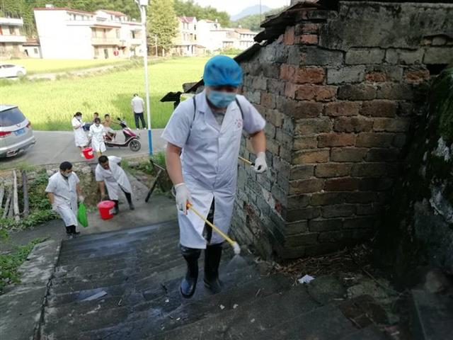 衛(wèi)生部門進(jìn)村灣對農(nóng)戶房前屋后進(jìn)行消殺,凈化環(huán)境。(胡劍芳攝)