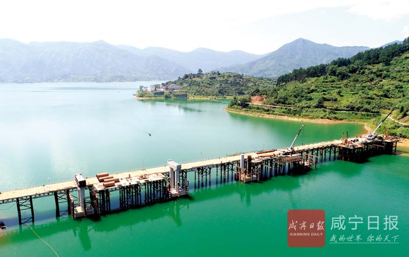 13日,通山縣慈口鄉(xiāng)富水水庫上,工人們正在澆筑橋墩。