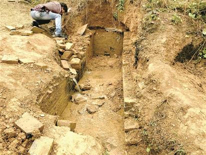 昨日上午,楚天都市報(bào)記者驅(qū)車來(lái)到該村,被盜的古墓離孫師傅家約有1公里路程,他帶著記者翻山來(lái)到現(xiàn)場(chǎng)。記者現(xiàn)場(chǎng)看到,該墓在一條公路邊上,墓穴已被挖開(kāi),長(zhǎng)約3米,寬約70厘米,墓室由青磚砌成。青磚比普通磚要薄,有的青磚上還有花紋。