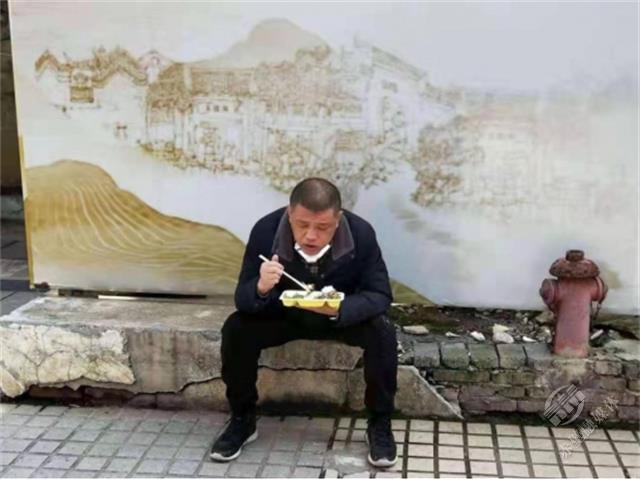 梁前明端著盒飯