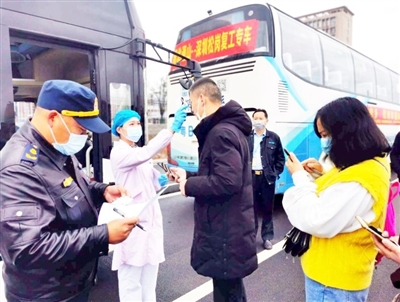 檢查身份信息、核驗(yàn)健康綠碼、監(jiān)測(cè)體溫、消毒……在現(xiàn)場(chǎng)工作人員的組織下,所有返崗復(fù)工人員有序上車。