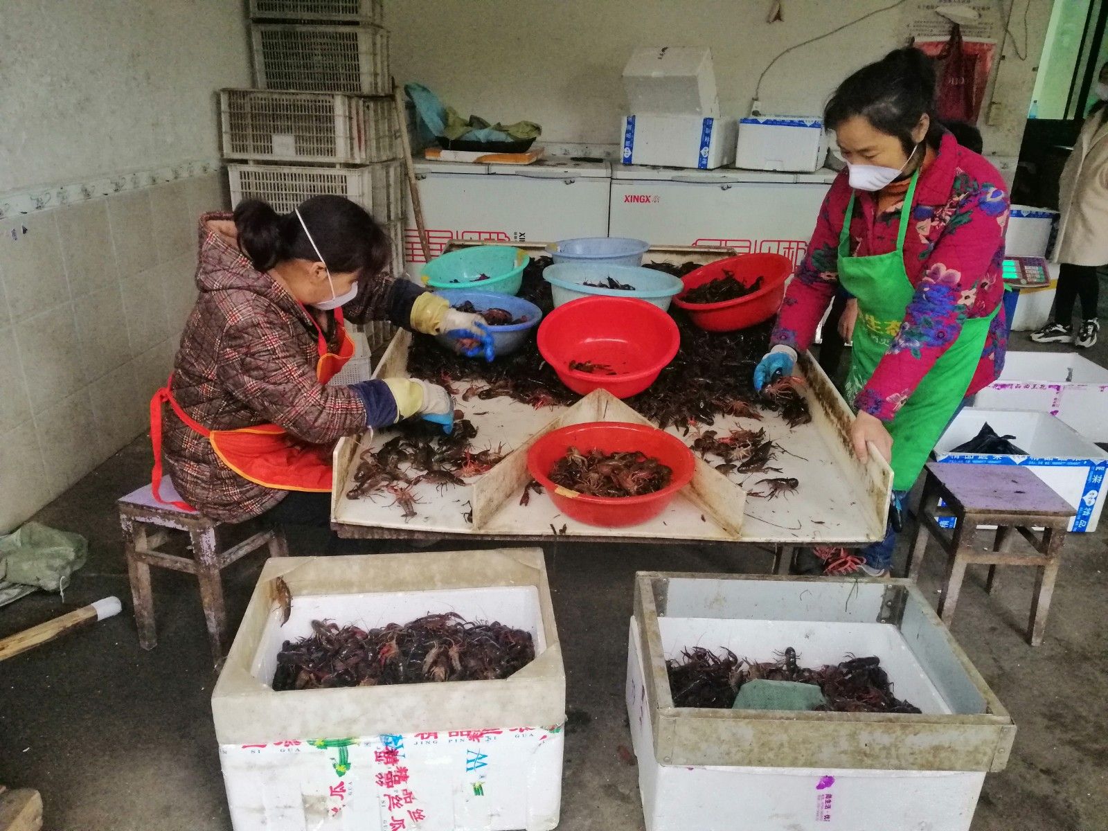 在官塘驛鎮(zhèn)泉口村神泉湖種養(yǎng)殖專業(yè)合作社,負(fù)責(zé)人童聰正在忙著將收購來的小龍蝦進(jìn)行等級(jí)分揀打包,準(zhǔn)備發(fā)往全國(guó)各地。該合作社現(xiàn)在每天小龍蝦成交量3000斤左右,高峰期保持在1.5萬斤,主要銷往江浙滬粵。