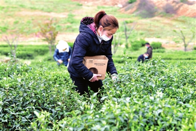 據(jù)了解,該基地由在外創(chuàng)業(yè)回鄉(xiāng)人員于2015年興建,占地500余畝,目前已逐步成園?;刈?月6日復(fù)工以來,日平吸納當(dāng)?shù)貏趧?dòng)力50余人次采茶。