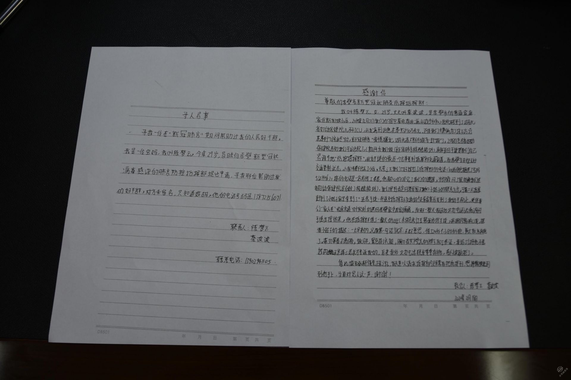 夫妻二人一直對這位胡姓同志十分感激,2月18日,陳夢云給市疫情防控指揮部寫了一封感謝信,同時希望他們能幫忙找到那位胡姓同志以便表示感謝。經(jīng)過一個半月的尋找,4月6日,夫妻二人終于得知——胡明浩,市衛(wèi)健局人事股科員,于是給其所在市新冠肺炎疫情防控指揮部送上錦旗。