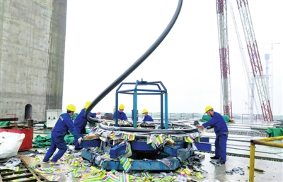 4月20日上午9時許,赤壁江畔,煙雨朦朧。隨著現(xiàn)場指揮人員一聲令下,塔吊吊鉤緩緩升空,一條長96.492米,重達(dá)6.40噸的“長龍”蜿蜒騰空而起,一端“穿針引線”地安裝在塔端1號索道管內(nèi)再脫空展索。