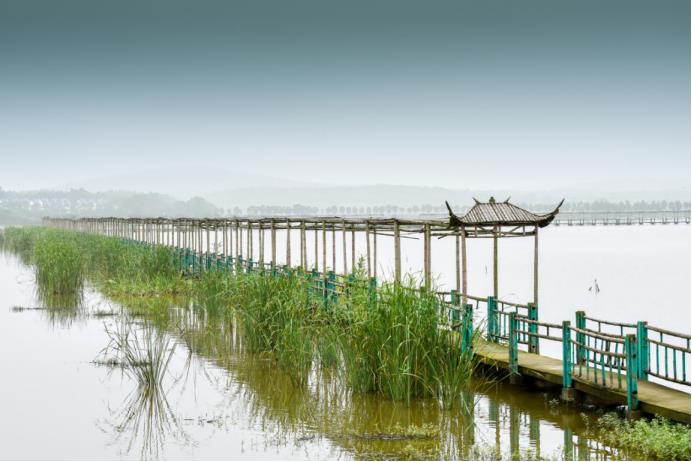 當天,木制釣魚臺上,一位50余歲的游客在休閑小釣。垂竿拋,紅煙斂,大有一番“人疑天上坐,魚似鏡中懸”的味道。也有三兩游客櫓槳戲水,一不小心,驚擾了覓食的魚兒,“潑刺”一聲,慌亂中撲騰至遠處,不見蹤影。
