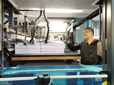3月3日,記者在山河文化發(fā)展有限公司看到,車(chē)間里機(jī)聲隆隆。在一個(gè)大型流水機(jī)器旁,一名員工專注地放紙,隨后機(jī)械打印、切割、檢驗(yàn)、裝訂成書(shū)……人機(jī)配合十分默契。