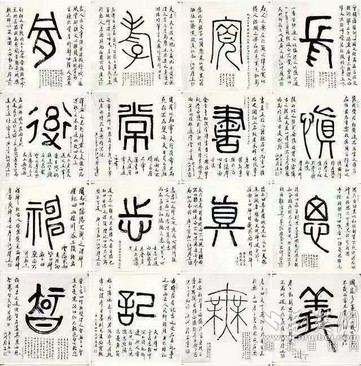 在創(chuàng)作中,陳履生用接近現(xiàn)代繪畫(huà)的方式,將字的主體以篆書(shū)寫(xiě)在中心位置,周?chē)孕袝?shū)題跋書(shū)寫(xiě)注釋、個(gè)人感悟等相關(guān)內(nèi)容,強(qiáng)化對(duì)這個(gè)字的認(rèn)識(shí)過(guò)程,讓人有更深刻的理解。如開(kāi)篇第二字“義”字的題跋,除了引用古籍中對(duì)義字的解讀,還加入了一句“時(shí)在國(guó)家多事之時(shí),義士善舉皆多”的感悟,與當(dāng)時(shí)“大疫當(dāng)前有大義”的情境十分貼合。