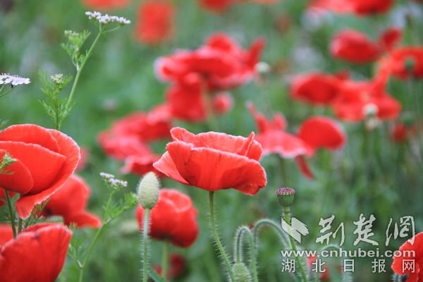 在罌粟屬的植物中,還有個(gè)常見的觀賞花卉虞美人,因?yàn)閮烧呋ㄆ谝恢?,外形相似,常常被公眾混淆。在罌粟籠子的周圍,武漢植物園還種植了上白株罌粟的“姐妹花”虞美人,方便市民對比鑒別。