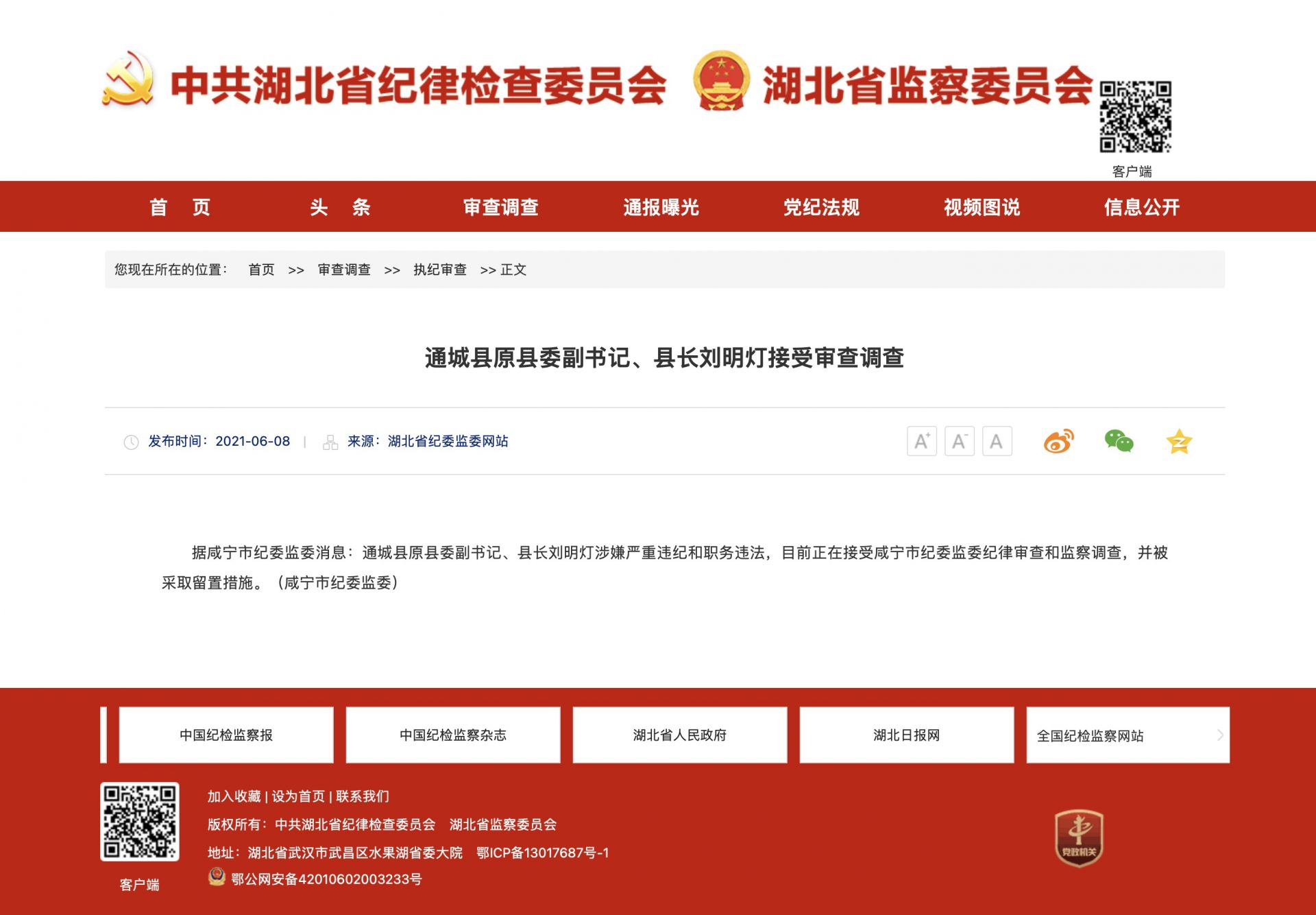 據(jù)咸寧市紀委監(jiān)委消息:通城縣原縣委副書記、縣長劉明燈涉嫌嚴重違紀和職務(wù)違法,目前正在接受咸寧市紀委監(jiān)委紀律審查和監(jiān)察調(diào)查,并被采取留置措施。
