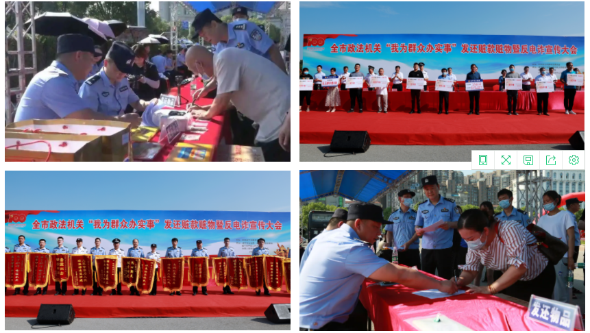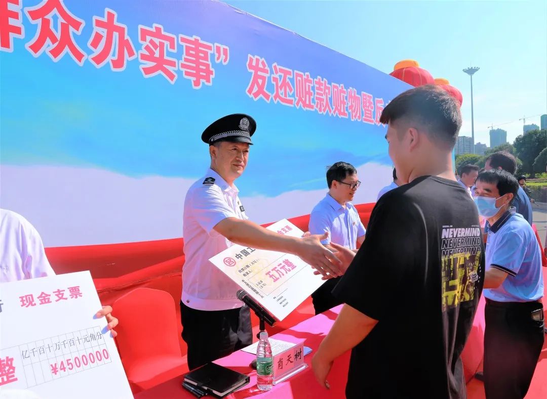 6月24日上午,全市政法機(jī)關(guān)隆重舉行“我為群眾辦實(shí)事”發(fā)還贓款贓物暨反電詐宣傳大會(huì),集中返還在偵察破案中追繳的部分贓款,以及汽車(chē)、筆記本電腦、手機(jī)、煙酒、郵票等被盜、被騙贓物,總計(jì)價(jià)值5038.6萬(wàn)元,彰顯了公安機(jī)關(guān)的打擊戰(zhàn)果,震懾違法犯罪,進(jìn)一步提升人民群眾安全感和滿(mǎn)意度。