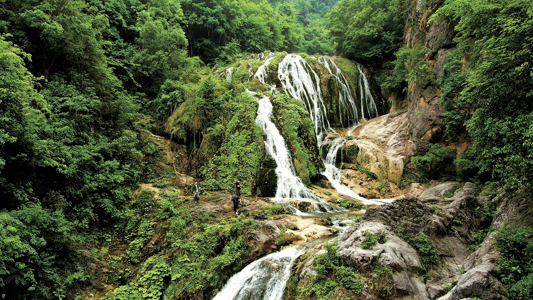 順著溪流下行半個(gè)多小時(shí),一條十幾米寬的激流被陡峭山崖阻擋后形成無數(shù)分支,從約20米高的大型鈣化梯坎上跌落。這是該河段最為壯觀的一處瀑布,氣勢磅礴,聲聞十里,如戰(zhàn)鼓擂動、萬馬奔騰。