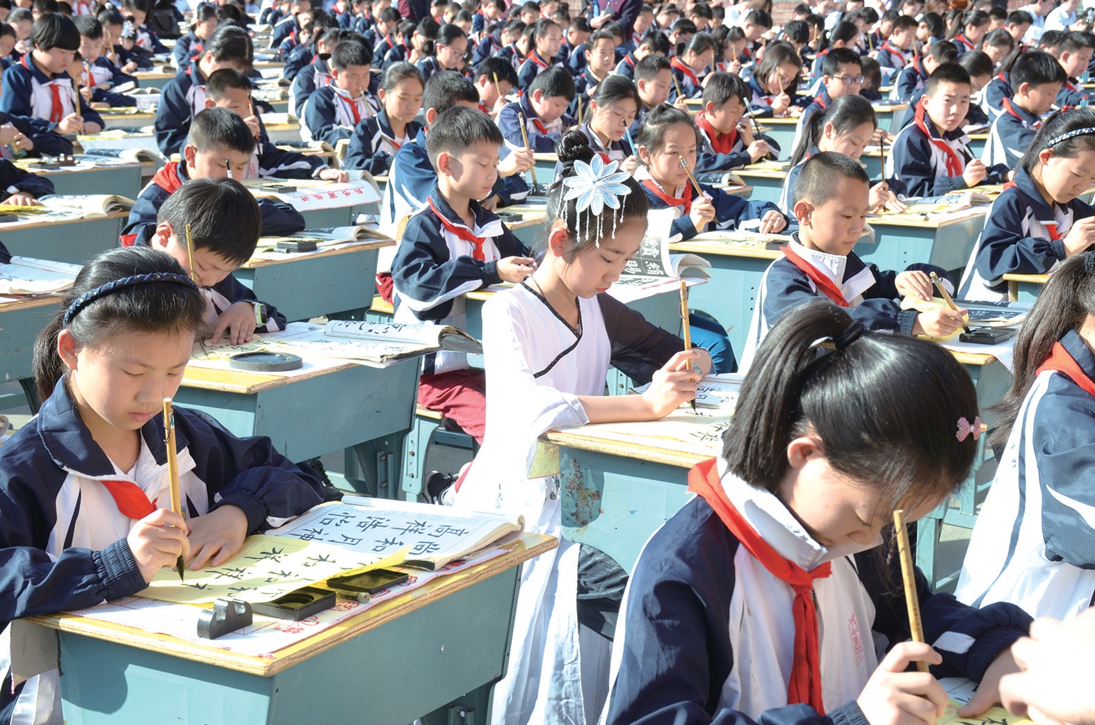 書寫是一個(gè)循序漸進(jìn)的過程,在孩子小學(xué)階段有意識(shí)地培養(yǎng),讓孩子養(yǎng)成良好的書寫習(xí)慣,其將會(huì)受益一生?!拔覀儗W(xué)校每天堅(jiān)持中午練20分鐘書法,孩子們學(xué)習(xí)書法的第一個(gè)內(nèi)容,就是坐姿訓(xùn)練?!睎|風(fēng)52小學(xué)校長(zhǎng)龔明說。