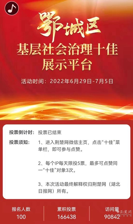據(jù)荊楚網(wǎng)后臺(tái)統(tǒng)計(jì),截至7月6日,該項(xiàng)活動(dòng)有9萬(wàn)余人參與,累計(jì)投票166438次,累計(jì)關(guān)注量達(dá)40萬(wàn)余人次。其中,花湖開(kāi)發(fā)區(qū)金雞橋社區(qū)東方太陽(yáng)城興勝物業(yè)12558票、“安居”+“安康”探索黨建引領(lǐng)基層治理新模式10506票、樊口街道杜山村黨總支9990票獲得此次網(wǎng)絡(luò)投票點(diǎn)贊總數(shù)前三。