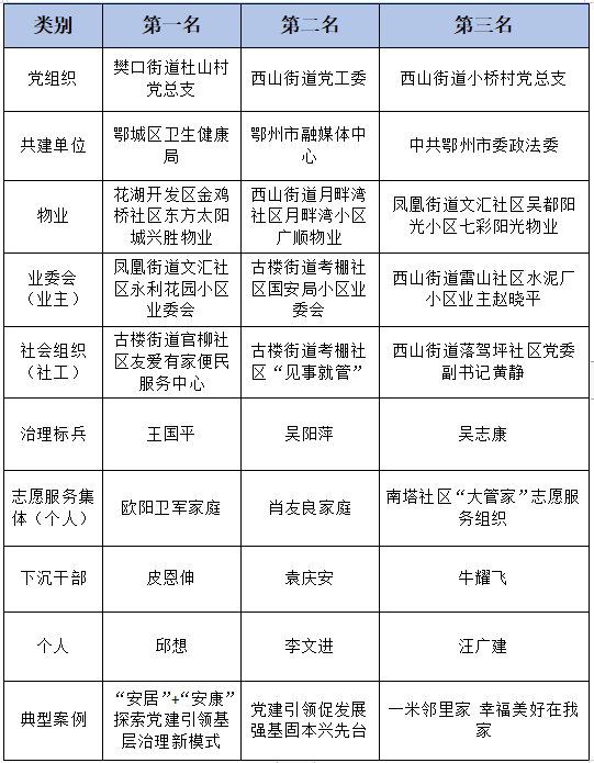 鄂城區(qū)基層社會(huì)治理十佳先進(jìn)典型名單于2022年6月29日—7月5日在荊楚網(wǎng)(湖北日?qǐng)?bào)網(wǎng))官方微信平臺(tái)進(jìn)行展示?;鶎由鐣?huì)治理十佳先進(jìn)典型分為黨組織、共建單位、物業(yè)、業(yè)委會(huì)(業(yè)主)、社會(huì)組織(社工)、治理標(biāo)兵、志愿服務(wù)集體(個(gè)人)、下沉干部、個(gè)人、典型案例等10大類(lèi)。