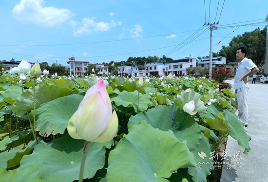 漫步在9組,17戶人家,家家戶戶門口都有一個“口袋花園”,觀賞花木,假山流水,不一而足;灣組中央盆地,“紅旗園林”已經(jīng)成型,風吹柳樹,萬條絲絳隨風而動,不遠處,藍天白云籠罩下,400畝蓮藕基地中荷花正盛,粉的、白的、青的花瓣被層層疊疊碩大的荷葉襯托著,“美得一塌糊涂”。