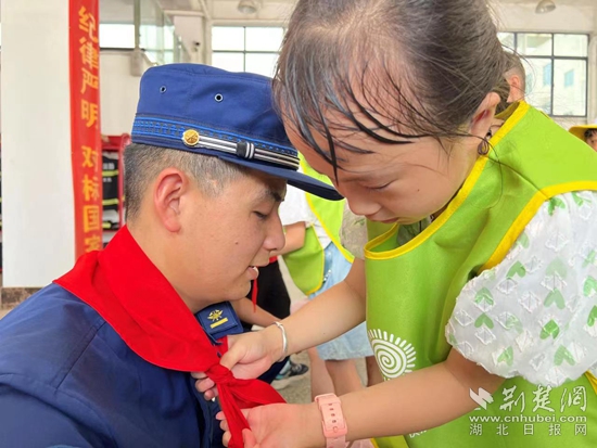 臨別之前,消防員為孩子們送上鉛筆、尺子等文具用品,孩子們依依不舍的為消防員戴上象征榮譽的紅領(lǐng)巾。