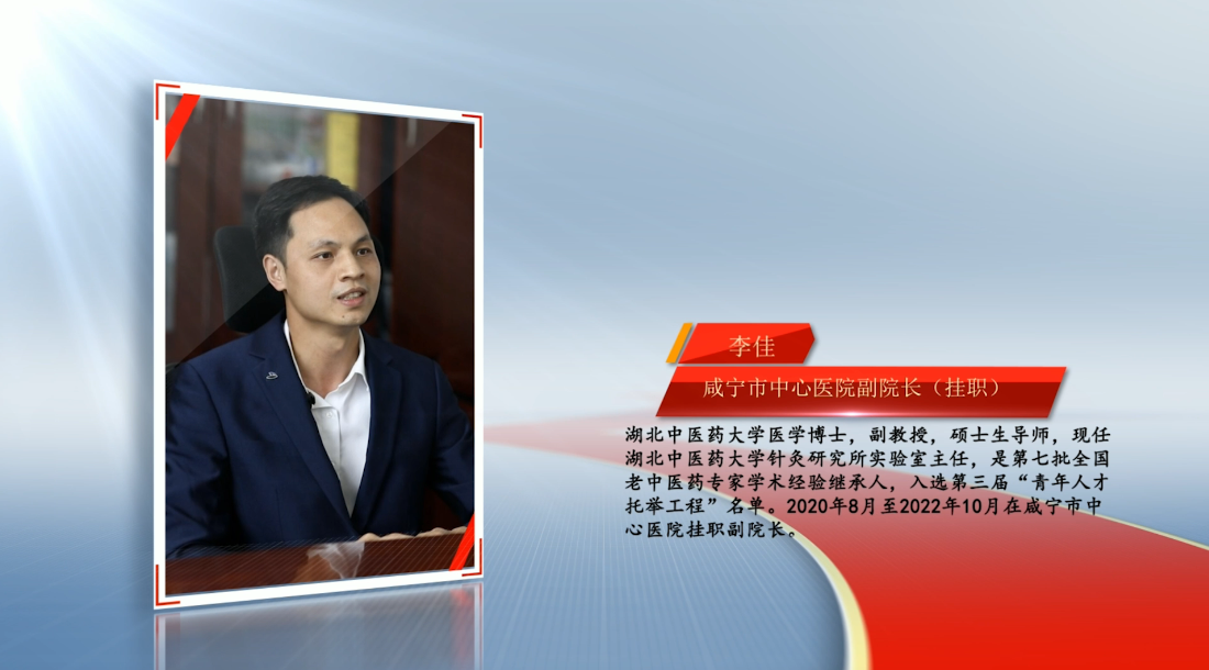 【人物名片】李佳, 湖北中醫(yī)藥大學(xué)醫(yī)學(xué)博士,副教授,碩士生導(dǎo)師,現(xiàn)任湖北中醫(yī)藥大學(xué)針灸研究所實驗室主任,是第七批全國老中醫(yī)藥專家學(xué)術(shù)經(jīng)驗繼承人,入選第三屆“青年人才托舉工程”名單。2020年8月至2022年10月在咸寧市中心醫(yī)院掛職副院長。