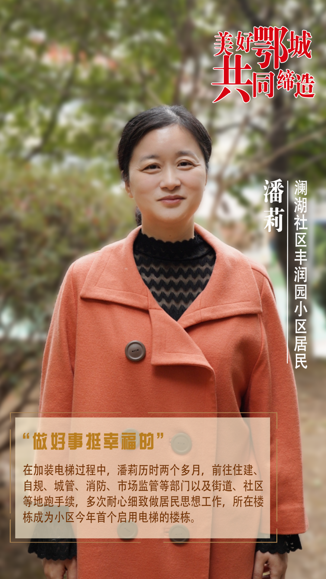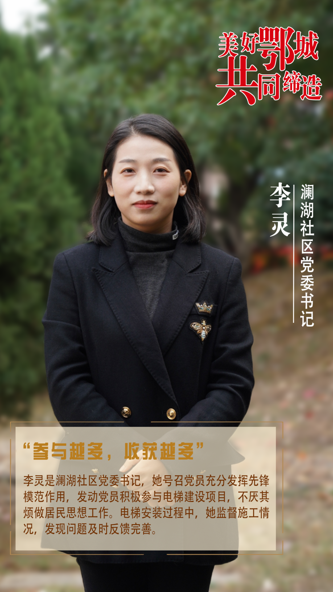 李靈是瀾湖社區(qū)黨委書記,她號召黨員充分發(fā)揮先鋒模范作用,發(fā)動黨員積極參與電梯建設(shè)項(xiàng)目,不厭其煩做居民思想工作。電梯安裝過程中,她監(jiān)督施工情況,發(fā)現(xiàn)問題及時反饋完善。