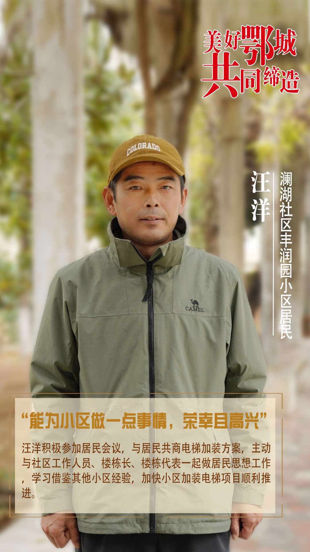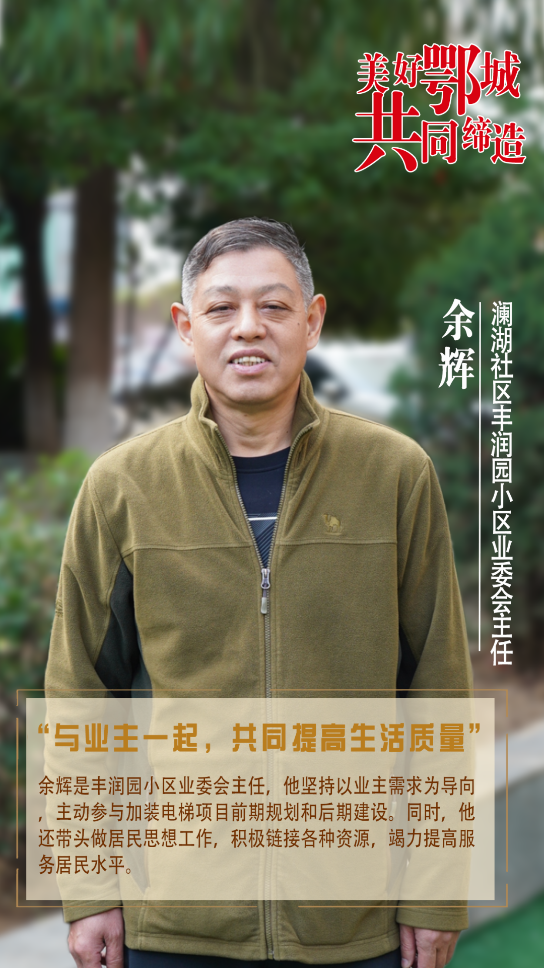 余輝是豐潤園小區(qū)業(yè)委會主任,他堅持以業(yè)主需求為導(dǎo)向,主動參與加裝電梯項(xiàng)目前期規(guī)劃和后期建設(shè)。同時,他還帶頭做居民思想工作,積極鏈接各種資源,竭力提高服務(wù)居民水平。