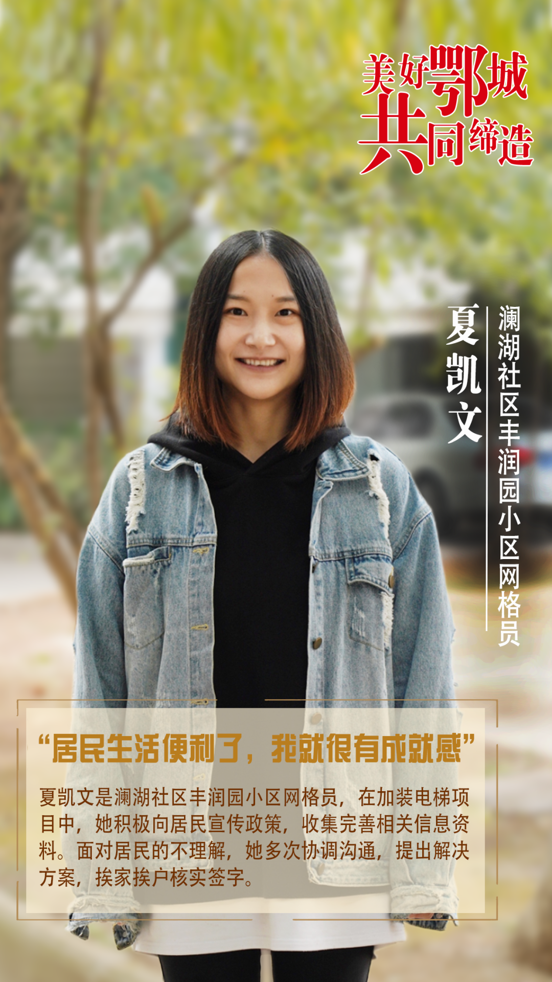 夏凱文是瀾湖社區(qū)豐潤園小區(qū)網(wǎng)格員,在加裝電梯項(xiàng)目中,她積極向居民宣傳政策,收集完善相關(guān)信息資料。面對居民的不理解,她多次協(xié)調(diào)溝通,提出解決方案,挨家挨戶核實(shí)簽字。