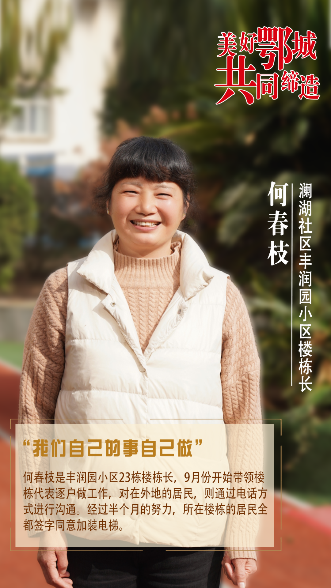 何春枝是豐潤園小區(qū)23棟樓棟長,9月份開始帶領(lǐng)樓棟代表逐戶做工作,對在外地的居民,則通過電話方式進(jìn)行溝通。經(jīng)過半個月的努力,所在樓棟的居民全都簽字同意加裝電梯。